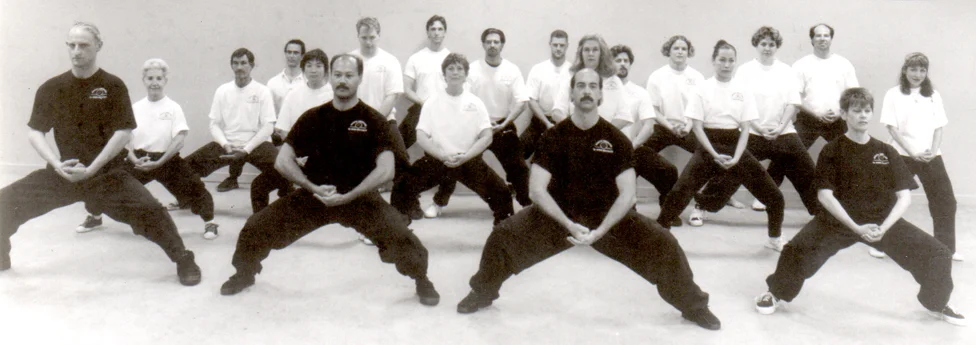 Center: 1993 – Fighters from the Ching Lung Martial Arts Kung Fu School in the Guan (Training Hall), Pacific Grove, California